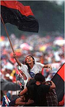 of the Sandinista National Liberation Front Party celebrate at the final pre-election party rally in Managua, Nicaragua |