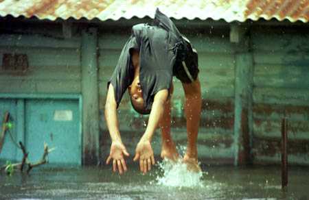 plays in front of a flooded house in Tipitapa, Nicaragua after the passage of Hurricane Mitch. |
